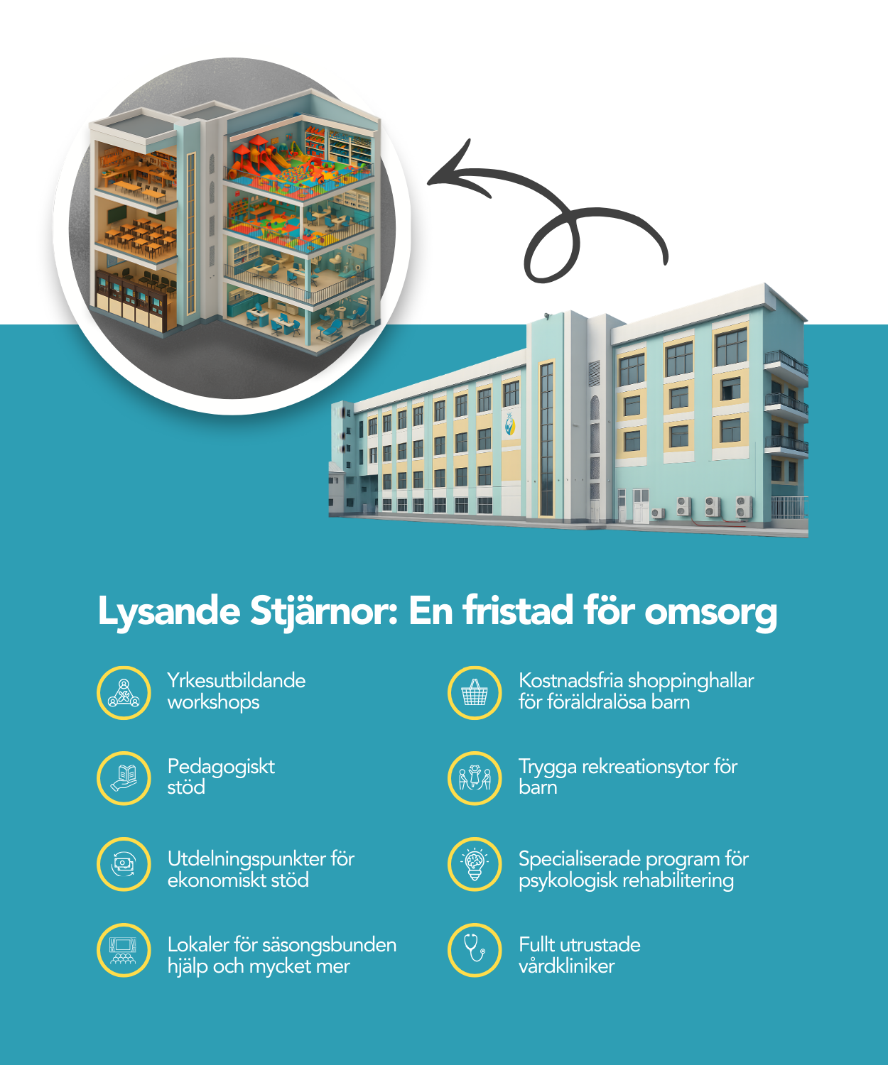 I Irak erbjuder våra Lysande Stjärnor Center heltäckande stöd genom en modell med sex pelare: ekonomiskt, medicinskt, psykologiskt, utbildning, yrkesträning och bostadsstöd. Genom denna metod har vi hjälpt över 110 000 föräldralösa barn, med långsiktig omsorg på nationell nivå.